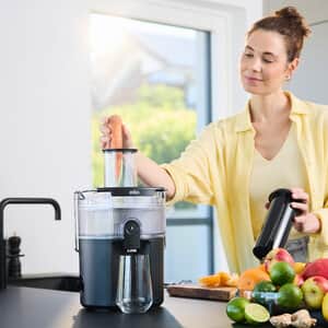 Tento odšťavňovač vám rychle a snadno připraví šťávu z čerstvého ovoce a zeleniny. Spojení technologií Braun FastXtract a ColdXtract zajišťuje, že každá sklenice* džusu bude bohatá na vitamíny a připravená za pouhých 15 sekund. Plnicí otvor o průměru 75 mm zkracuje dobu přípravy na minimum – snadno pojme velké kusy ovoce a zeleniny, a dokonce i celá jablka. Velká nádoba na dužinu navíc umožňuje nepřerušované odšťavňování, aniž byste museli dužinu vyprazdňovat – bez problémů odšťavníte až 2 l zdravé šťávy.