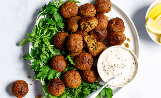 Vyndejte falafelovou směs z ledničky. Vezměte přibližně 40 g hmoty a vytvarujte ji do kuličky, přendejte na talíř nebo pečicí plech. Tento krok zopakujte se zbývající falafelovou směsí.