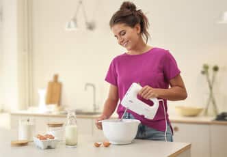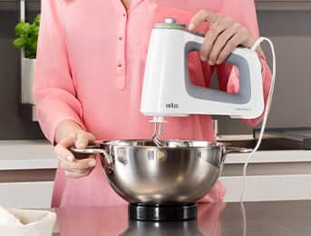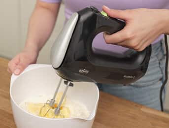 Regle die Geschwindigkeit deines Handmixers ganz einfach mit einer Hand – so hast du die Freiheit, mit der anderen Hand Zutaten hinzuzufügen oder die Schüssel festzuhalten.