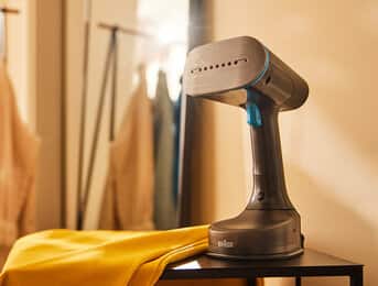 Beseitigt in Sekundenschnelle bis zu 99,99 % der Bakterien und Viren aus Kleidung und Heimtextilien.* Einfach abdampfen und eine saubere Umgebung genießen. * Unabhängiger Labortest. Maximale Temperatureinstellung auf Baumwollgewebe,3 Glättvorgänge (0,5 cm/Sek) - siehe www.braunhousehold.com.