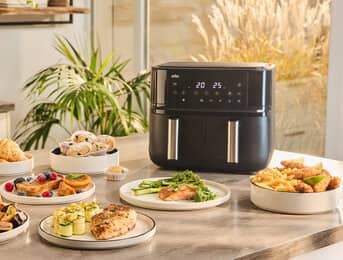 Genieße eine komplette Mahlzeit – mit der Braun TwinCook 3 Heißluftfritteuse kannst du zwei verschiedene Gerichte auf einmal zubereiten und so eine komplette Mahlzeit 50 % schneller* genießen. Die Sync Funktion übernimmt das perfekte Timing. Mit nur einem Knopfdruck sind beide Gerichte gleichzeitig fertig, trotz unterschiedlicher Zubereitungszeiten. Die RealAir Technologie sorgt für köstlichen Geschmack – mit bis zu 90 % weniger Fett**. Und die spülmaschinengeeigneten Garkörbe machen die Reinigung zum Kinderspiel.