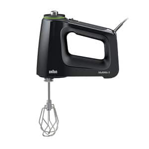 The MultiMix 5 Hand mixer delivers 50% more power* than leading competitors. With its 350-watt motor, you can whisk, knead and chop even the toughest ingredients for your favorite recipes with excellent results. Braun’s SmartMix technology redistributes the weight of the mixer out of your hand and into the bowl, cutting your effort in half. Designed with a completely sealed system, it prevents anything from getting into the housing for quick and easy cleanup and long-lasting performance. The one-touch VarioControl speed dial lets you fine-tune your mixing with 9 speeds, plus Turbo for your toughest ingredients. The unique MultiWhisk attachment is both whisk and beater in one. Its dual-action design creates greater volume for light, airy mixtures. Homemade bread is no challenge for this mixer with its included sturdy dough hooks. And the versatile chopper attachment lets you prep dry ingredients like nuts and chocolate before combining with the mixture. With signature Braun design and engineering, you'll love the lightweight comfort and control of the soft-grip, slip-resistant handle. So let the baking begin! *Wattage and mixing effort (mixing cake batter, external tests) compared to leading competitors.