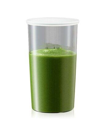 The 600 ml plastic beaker comes with a convenient lid so that you can hygienically store any freshly blended leftovers in the fridge. Thanks to the special lid, you can easily take the beaker with you on-the-go.