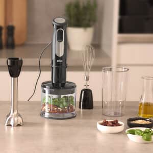 Grâce aux nouveaux accessoires, le MultiQuick 5 Pro vous offre une polyvalence sans limite pour cuisiner. Équipé de la technologie PowerBell VPlus, le MultiQuick 5 Pro fournit des résultats jusqu'à 4 fois plus fins. * La vitesse peut être réglée d'une seule main et les 25 niveaux facilement réglables jouent efficacement avec le puissant moteur de 1.000 watts - vous allez être enthousiasmé.