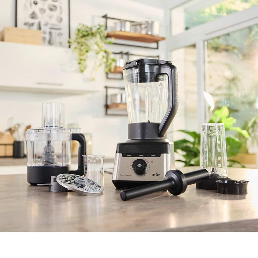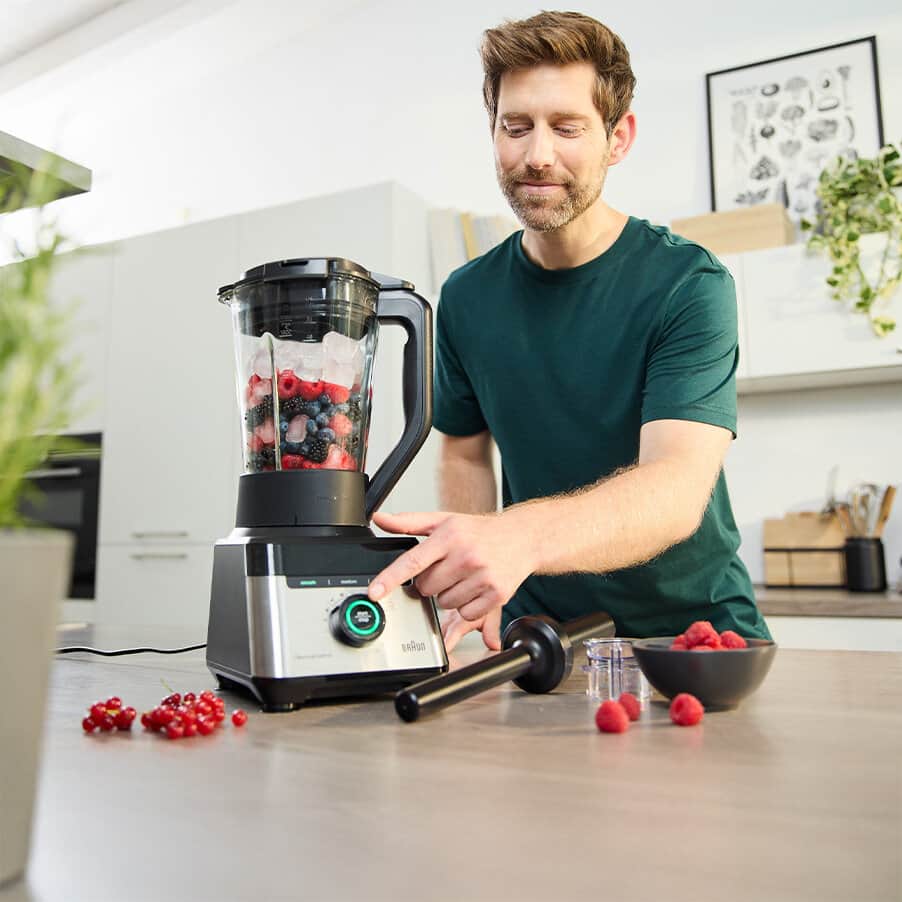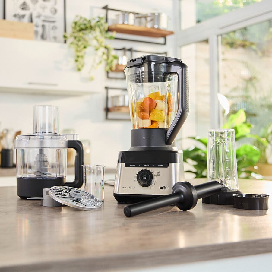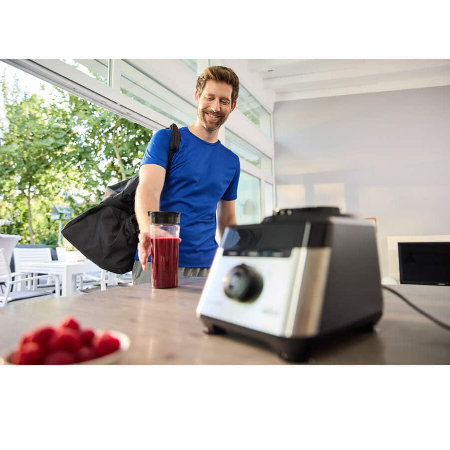 Le super blender PowerBlend 7 de Braun est votre allié tout-en-un pour une alimentation saine. Profitez de la polyvalence inégalée des fonctions 5-en-1 de cette combinaison peu encombrante comprenant un blender, un robot multifonction et un préparateur Smoothie2Go. Des smoothies onctueux à la texture épaisse, vous avez le choix. iTextureControl vous permet de personnaliser votre texture idéale à chaque fois. Vous vous sentirez comme un professionnel en cuisine grâce à des résultats 50 % plus fins, deux fois plus rapides*, rendus possibles par le puissant moteur de 1 400 watts associé à la technologie TriAction du bol.