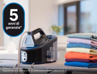 1. Dal 22/01/2024 al 31/05/2026 acquista un ferro da stiro o un sistema stirante Braun e registra il prodotto nell’apposita sezione. 2. Entro 24 ore dalla richiesta a seguito di verifica, riceverai tramite email l'attestato che garantirà l'assistenza gratuita per 3 ulteriori anni (successivi ai 2 di garanzia legale).
