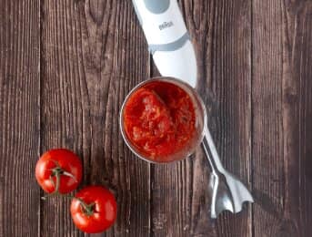 Usare il minipimer è un trucco veloce e pratico per regolare la consistenza della tua passata di pomodoro fatta in casa. Il MultiQuick 5 Vario di Braun, ad esempio, grazie alla sua potenza e precisione è perfetto per ottenere una crema vellutata, ma se preferisci una consistenza più rustica, ti basta frullare i pomodori per meno tempo.