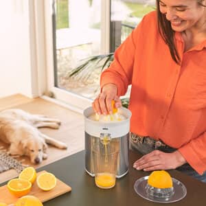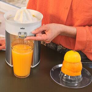 Con il suo elegante alloggiamento in acciaio inox spazzolato e il design premium, CitrusQuick 5 è una novità accattivante per qualsiasi cucina. Progettato per consentirti di centrifugare facilmente quantità maggiori, il beccuccio alto si adatta a bicchieri di altezza fino a 14 cm. E una volta terminata la spremitura, basta inclinare il beccuccio salvagoccia verso l’alto per evitare che il succo cada sul bancone della cucina. Grazie al cono di spremitura universale, ottieni quanto più succo possibile da agrumi sia piccoli che grandi, senza dover cambiare i coni.