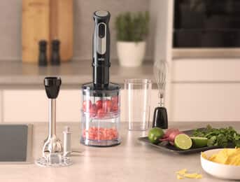 Grazie a una nuova gamma di accessori, puoi godere della massima versatilità in cucina con MultiQuick 5 Pro. Affetta, sminuzza, trita o miscela le tue deliziose salse con il nuovo Mini robot da cucina. Con un ingombro ridotto del 45%**, puoi risparmiare spazio senza rinunciare alle funzionalità. Il tritatutto SizeControl è una soluzione 3 in 1 che consente di tritare gli alimenti duri in tre diverse consistenze e di tritare il ghiaccio. MultiQuick 5 Pro è dotato della tecnologia PowerBell V Plus per risultati fino a 4 volte migliori*. Apprezzerai la perfetta sinergia tra i 25 livelli di velocità variabile con una sola mano e il motore da 1000 W ad alta efficienza.