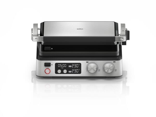 *調理用ホットプレートとの比較試験において。 設定温度約230℃までの到達時間=ブラウン約4分に対し調理用ホットプレート約6分、 ハンチング幅=ブラウン約8℃に対し調理用ホットプレート約70℃。 第三者機関における熱伝導スピード試験結果、2023年11月実施