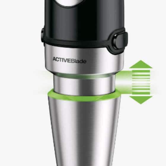 世界初のシャフトがしなやかに上下するアクティブブレードテクノロジー(特許取得済み)を搭載し、撹拌範囲は約2.5倍*に広がり、食材を逃さずしっかりキャッチ。