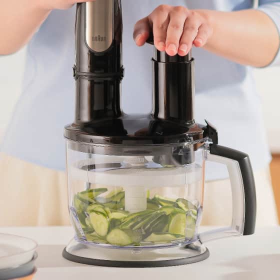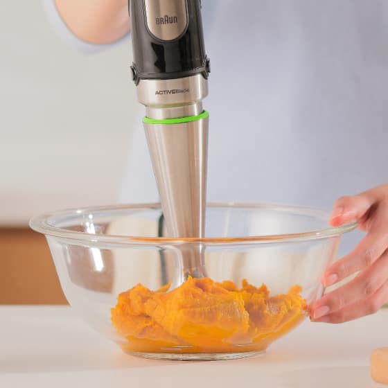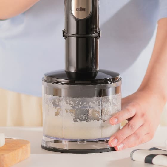仕上がりはキレイに。キッチンは汚さずブラウン独自のスプラッシュコントロールテクノロジーで、飛び散りをしっかりガード。鍋やボウルの中で直接使っても、服やキッチンを汚しにくく、片付けまでスマートに。