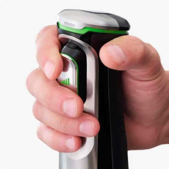 直感を、精度に。握る力で無段階にスピードを調整できるアドバンスドスマートスピードと、低速・高速・パルスの3モードから選べるiモードテクノロジーを組み合わせたハイブリッド制御。繊細なとろみから、食感を残す粗仕上げまで、思い描いた通りに。感覚的な操作が、精度ある仕上がりに直結する──あなたの料理にふさわしい、一歩先の使いやすさ。