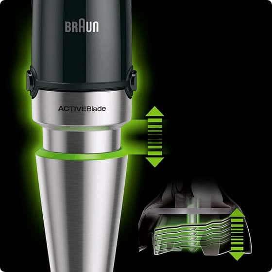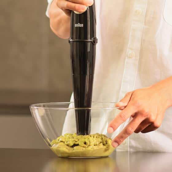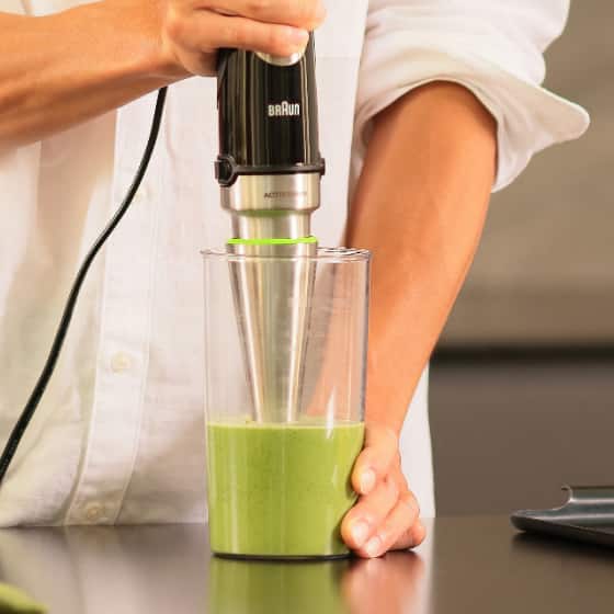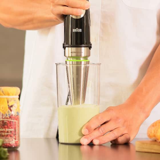 動きに応える刃。手の感覚が、仕上がりを変える。 世界初、上下にしなやかに可動するブラウン独自のアクティブブレードテクノロジー搭載。(特許取得済み) 撹拌範囲は約2.5倍*、食材の取りこぼしを防ぎ、硬い食材も、手に伝わる感覚のままにコントロール。 最大50%*の時短で効率よく、驚くほどなめらかな仕上がりへ。