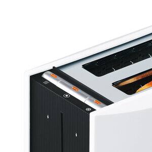 Reheat,stop and defrost functions are located at the top of the toaster. Lift and browning setting control are on side.