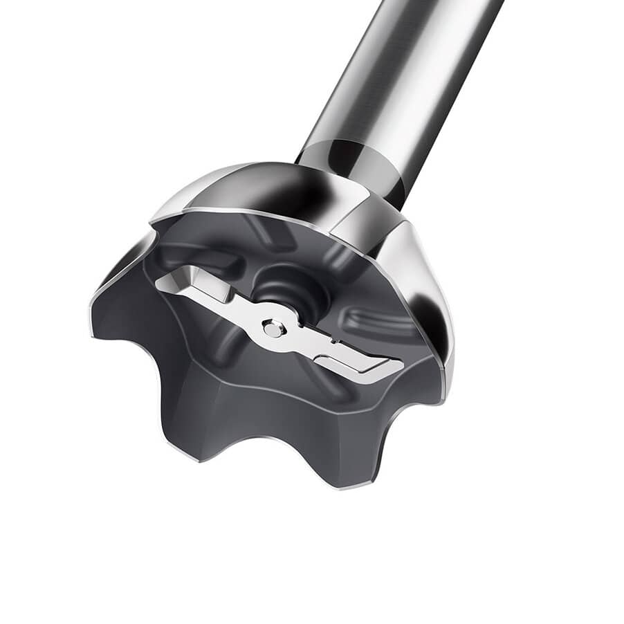 Nawet o 50% szybsze i 5-krotnie dokładniejsze rezultaty blendowania*. Dodatkowe ostrze tnące i sześć wypustek znajdujących się we wnętrzu stopy sprawiają,że składniki nieustannie trafiają do obszaru cięcia. *W porównaniu z Model Braun MQ100 w przypadku mleka migdałowego