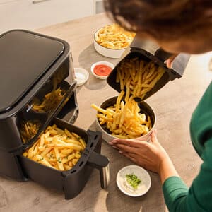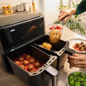 Z łatwością przygotuj cały posiłek – nowy Braun TwinCook 3 umożliwia jednoczesne gotowanie dwóch różnych potraw, dzięki czemu gotowanie jest o 50% szybsze*. Zapomnij o zmartwieniach związanych z czasem: jedno naciśnięcie przycisku Synchronizuj wystarczy, by obie potrawy były gotowe w tym samym czasie. Zdrowy sposób gotowania, zużywający do 90% mniej tłuszczu* bez utraty smaku i tekstury dzięki technologii RealAir Technology. Szuflady nadające się do mycia w zmywarce ułatwiają czyszczenie.